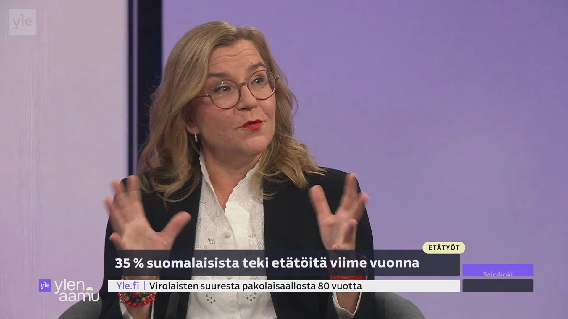 Etätyö on tapa organisoida työtä ja se on pandemian jälkeen ollut hyvin yleistä Suomessa. Kokopäiväisestä etätyöstä on siirrytty hybridiin, jossa välillä ollaan toimistolla ja välillä kotona. Nyt hybridimallille haetaan Suomessa tasapainoa. Työhyvinvointi ei ole palautunut pandemiaa edeltävälle tasolle. Koska sitä täytyy kehittää, oli työskentelytapa mitä tahansa, mitä pitäisi tehdä? Keskustelemassa Aalto-yliopiston tutkimusjohtaja Hertta Vuorenmaa ja Työterveyslaitoksen pääjohtaja Antti Koivula.